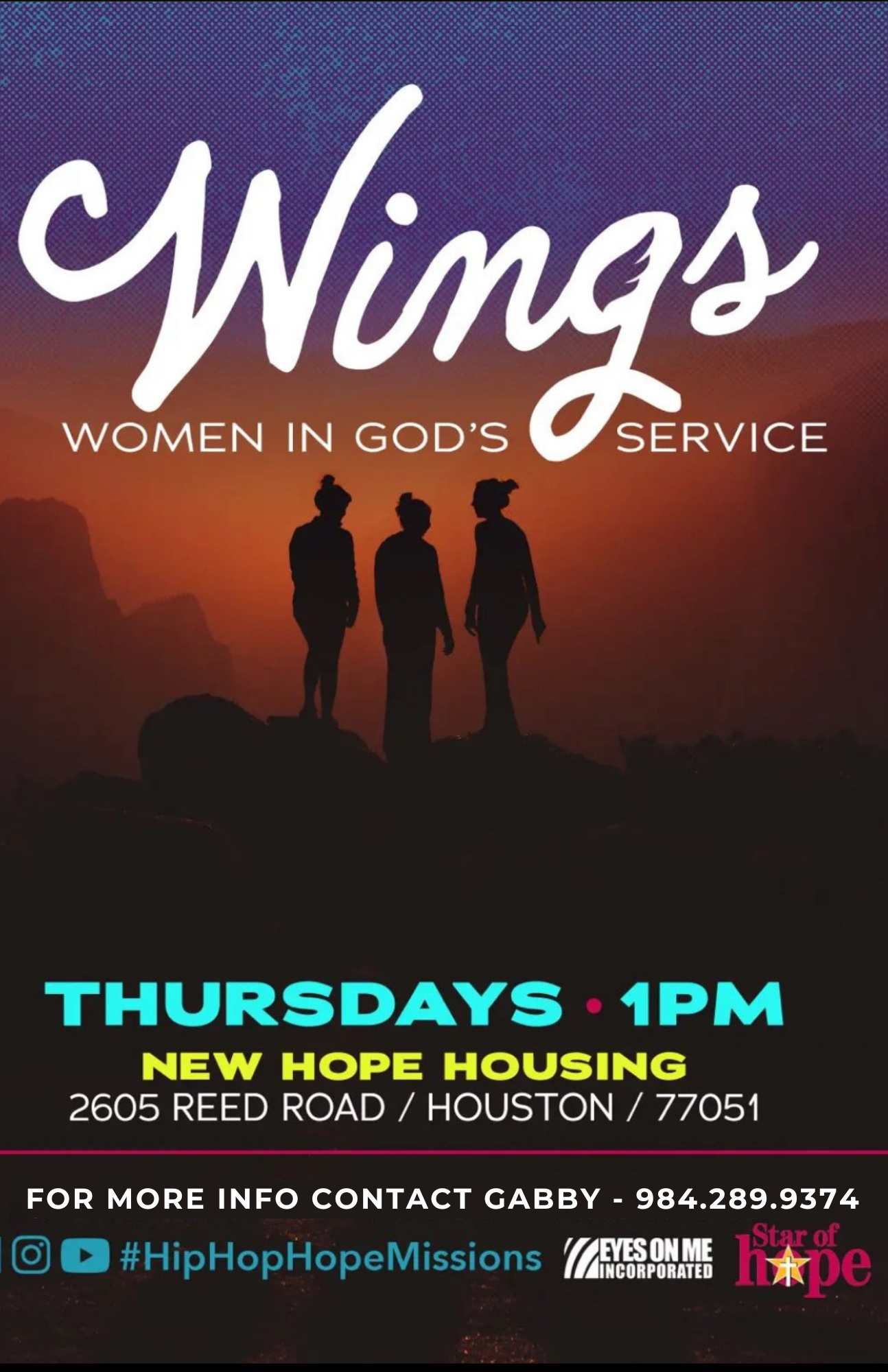 WINGS (Women In God's Service) is a safe haven for women seeking after God that come together for fellowship, sisterhood and worship. Food and childcare are provided.