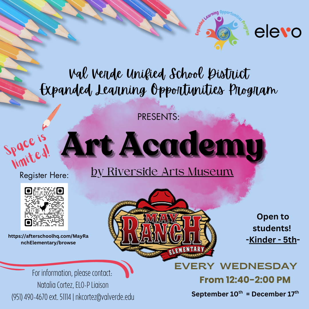 Student will have the amazing opportunity to engage in an art lesson provided by instructors from Riverside Arts Museum. This Academy is every Wednesday from 12:40 - 2:00pm. Pick up is at the gate closest to the front office.