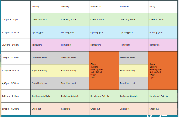 ELO Platinum offers the schedule below which includes: Supper, Opening Game, Homework, Physical Activity, and Enrichment!