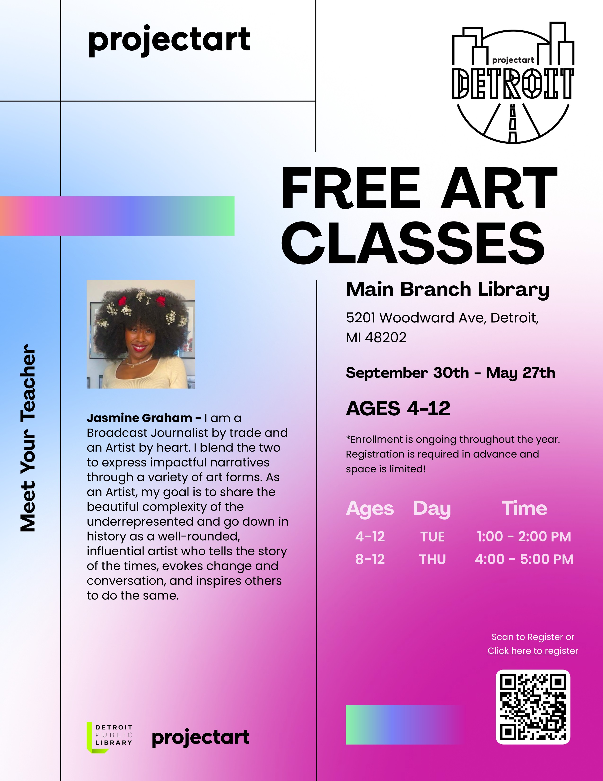 ProjectArt’s free classes run from September - May. Materials are provided for all students ages 4-18. Local, professional artists teach classes aligned with the National Arts Education Association standards and are informed by the teaching artist's personal artistic practice. ProjectArt classes are fun, imaginative and cultivate a love of learning.