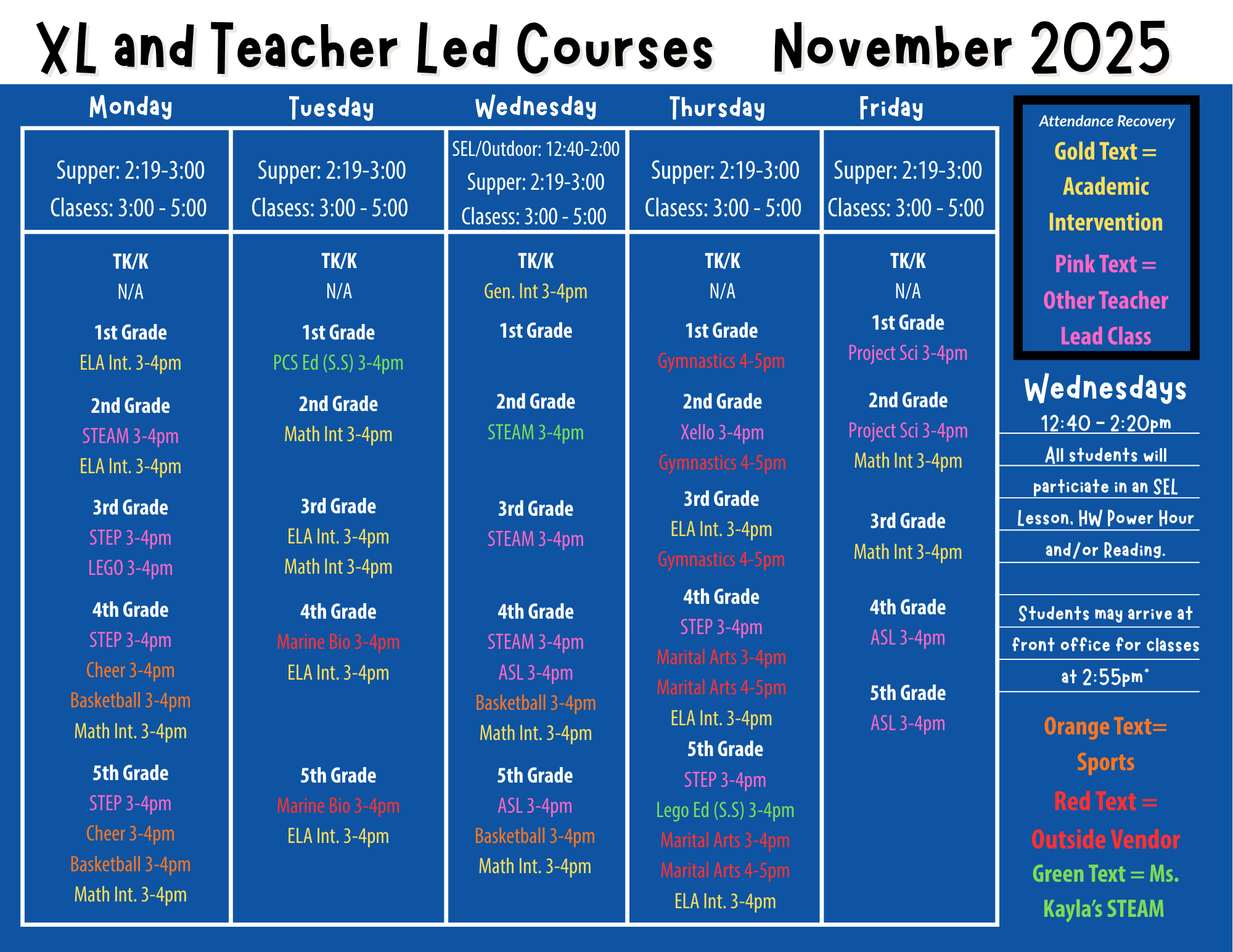 "Beyond the Classroom" is an enriching after-school program at Ridgemoor Elementary (and at all other MUSD sites) designed primarily for our unduplicated student population and TK/Kinder students. Catering to grades TK-5, the program offers a variety of engaging activities that foster creativity, collaboration, and academic growth, creating a supportive environment where all students can thrive. As we expand, we look forward to welcoming more students to experience the joy of learning beyond the traditional classroom setting. Our staffing needs are predominately met by the Boys and Girls Club of Riverside. Course offerings rotate each trimester. Attached is our Winter schedule for XL classes.