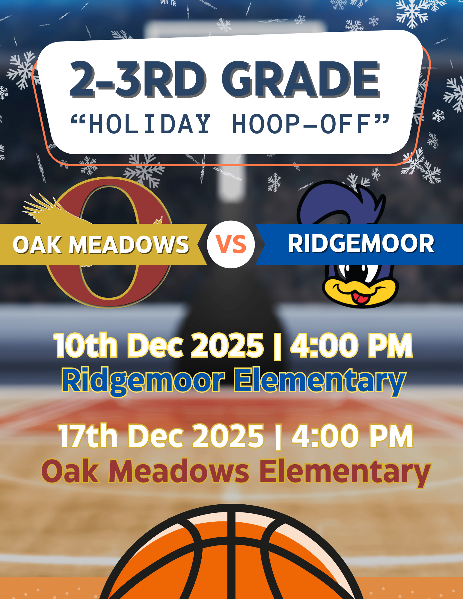 • Wednesday, December 17 – Game at Oak Meadows Elementary (4:00 PM)