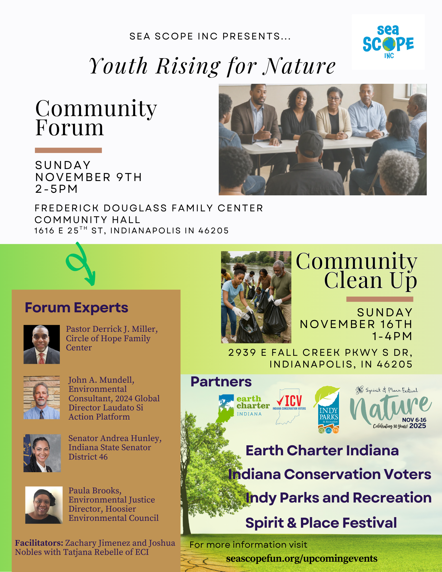 A continuation of our Nat Geo Slingshot Challenge student project proposal and call to action from Zachary Jimenez, Sea Scope Inc in partnership with Earth Charter Indiana and others is hosting our first community clean up! Join us! Sea Scope Inc youth registration here only. Others will register online via our website at a later time.