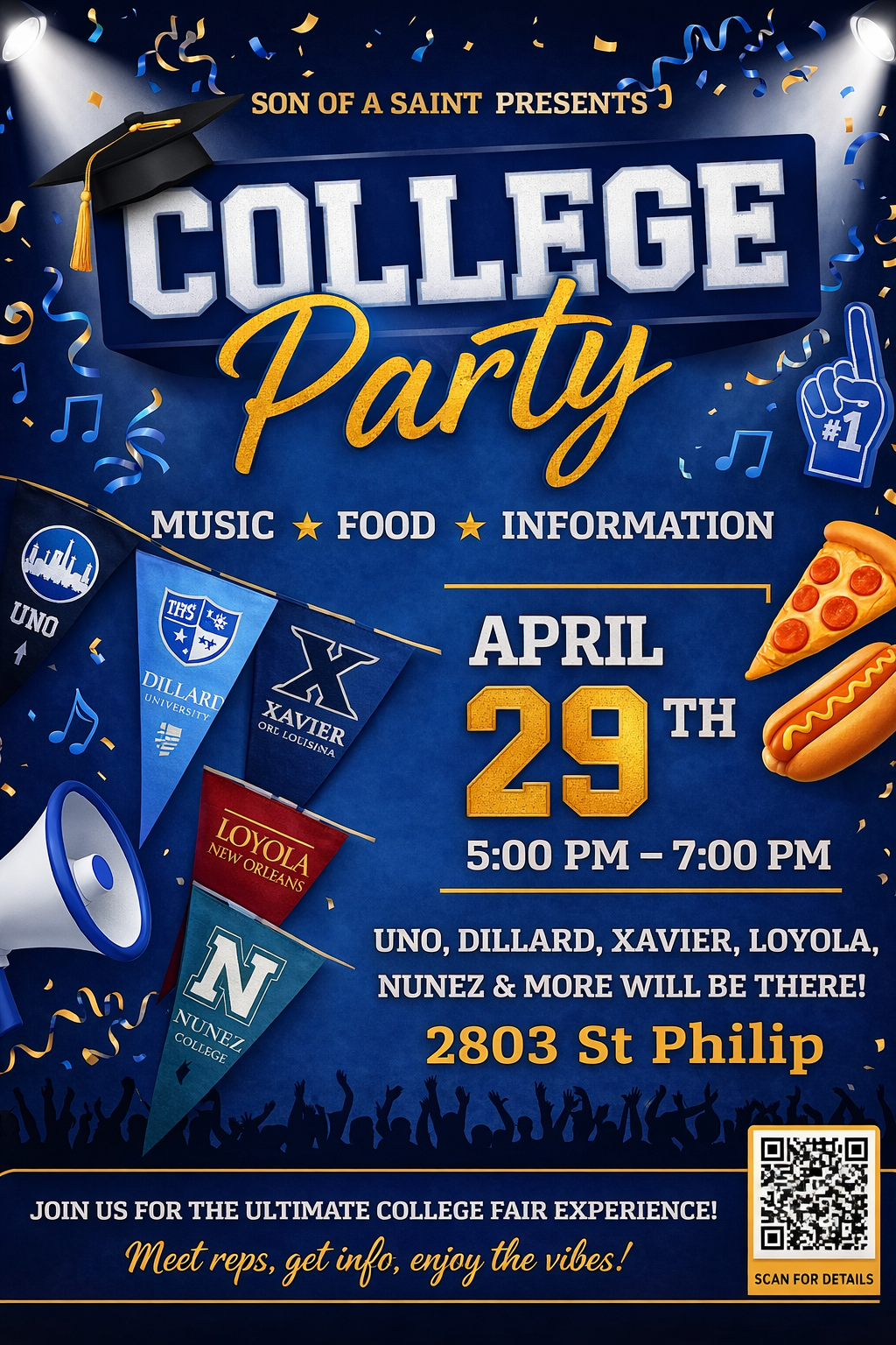Get ready for an unforgettable evening of music, food, and college exploration! Join us on April 29th from 5 PM – 7 PM at 2803 St. Philip St for a high-energy event where students can connect with top colleges, enjoy live music, grab delicious food, and win exciting prizes.
