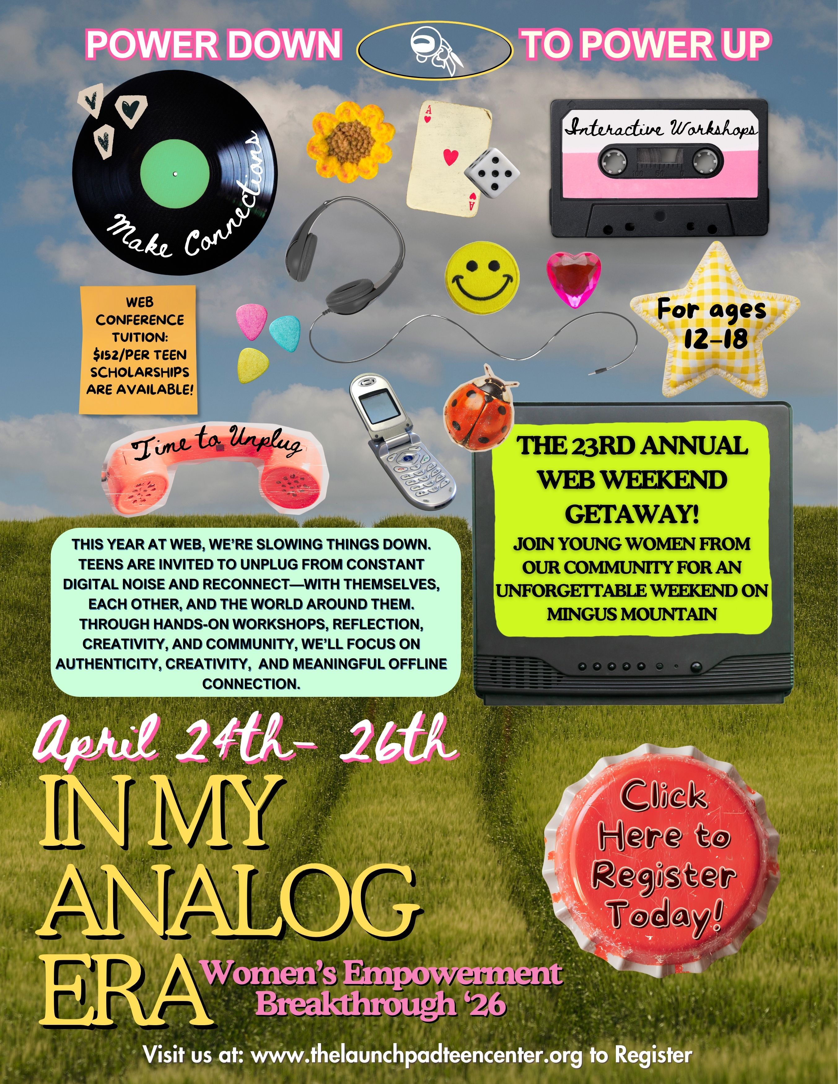 Join young women from across Arizona on Mingus Mountain for the 23rd Annual Women’s Empowerment Breakthrough (WEB) Weekend Conference. This year’s theme, In My Analog Era: Powering Down to Power Up, inviting teens to unplug from outside pressures, reconnect with themselves, and build confidence, leadership, and community in a supportive, distraction-free environment.