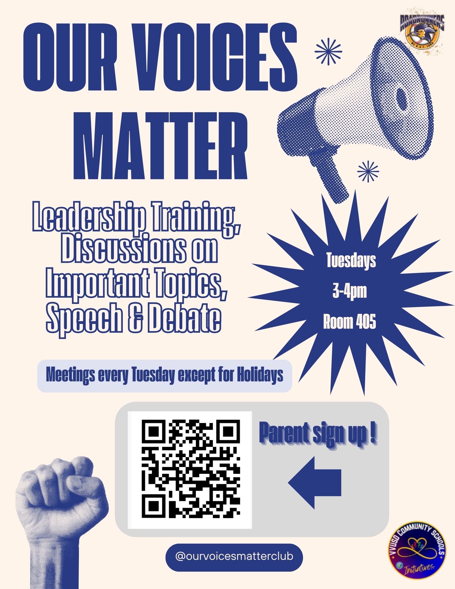 Our Voices Matter! Tuesday 3-4 pm Room 405.