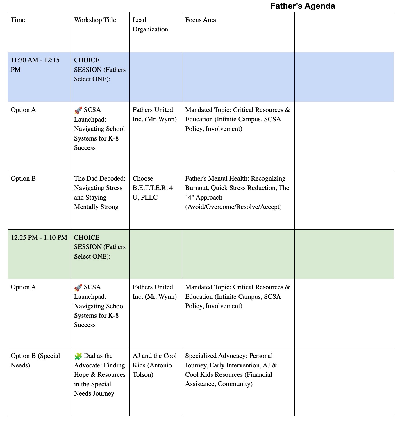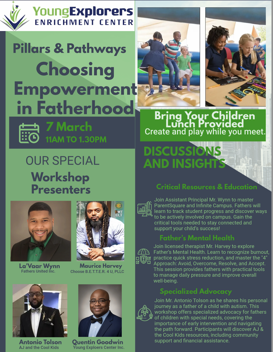 Pillars & Pathways is designed to help fathers grow as leaders and strengthen their families. Dads will attend workshops on important topics like mental health, school success, and better communication. While fathers learn, children will enjoy supervised fun. The program provides a supportive space for men to build new skills and connect with other parents in the community. Together, we empower fathers to overcome challenges and build a bright future for their children.